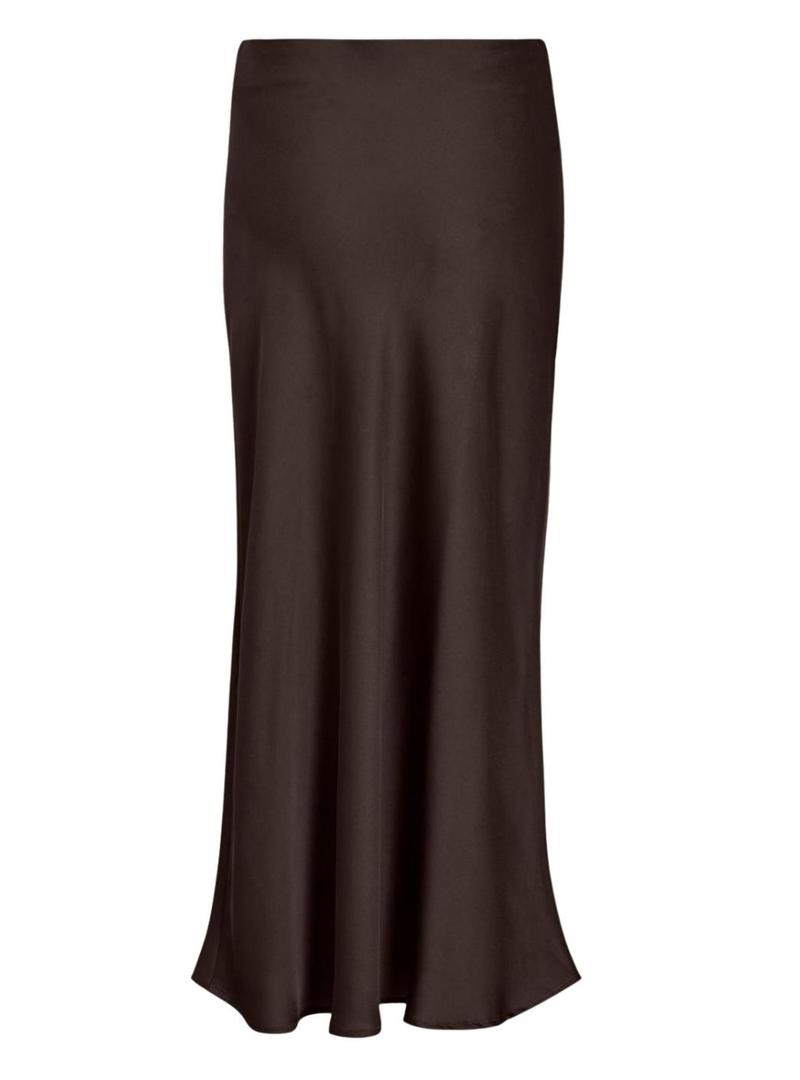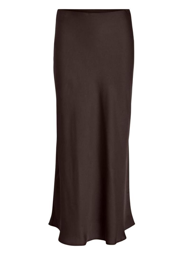 Saia de cetim da Vila. Modelo Viellette. Cor marrom. Comprimento midi com cintura alta. Faixa elástica na cintura.