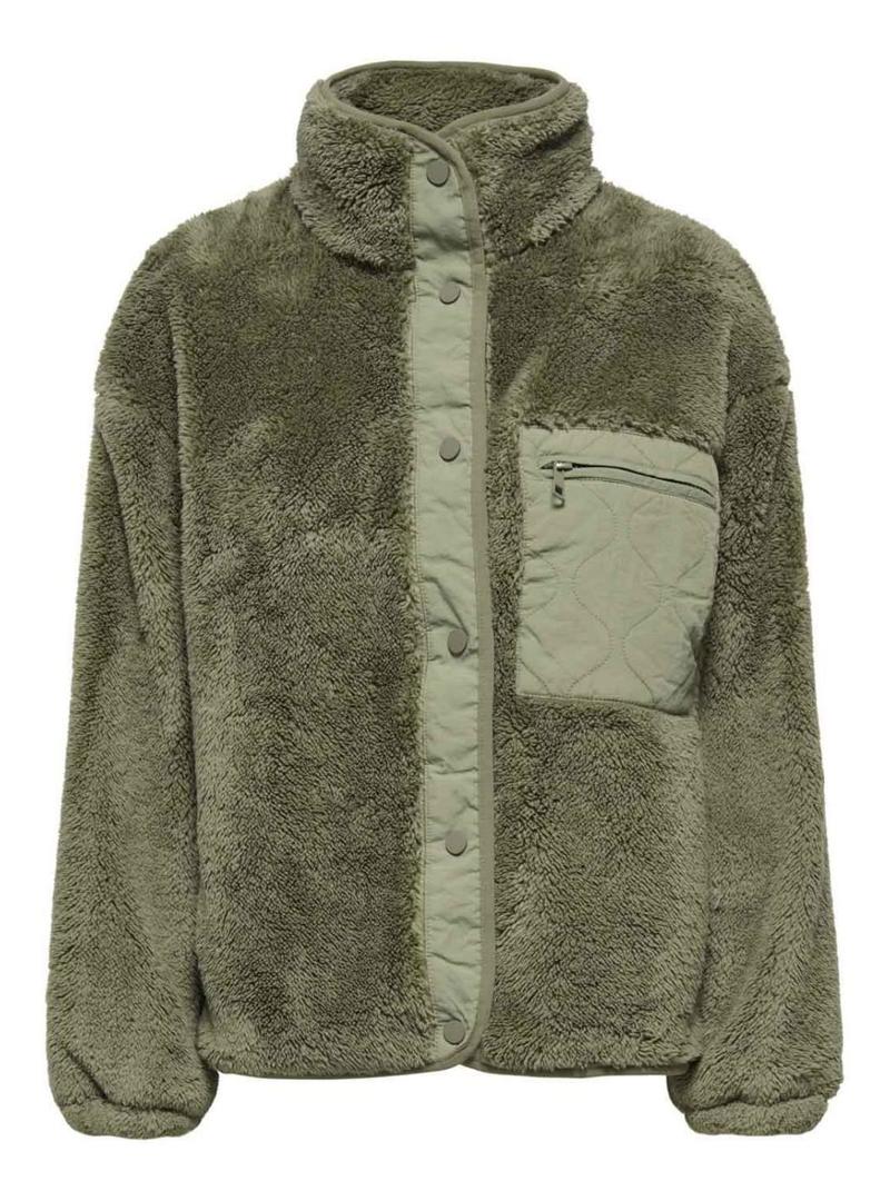 Casaco Only. Modelo Cantact. Estilo sherpa. Cor verde. Gola alta. Fecho com botões. Bolso de remendo no peito com zíper. Tecido de pelo macio. Bolsos laterais. Detalhes em tecido liso.