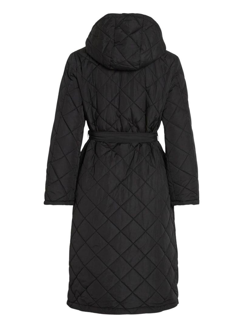 Casaco comprido acolchoado da Vila. Modelo Vikante Quilted. Cor preta. Capuz removível. Acolchoado com motivo de losangos. Cinto removível na cintura. Dois bolsos frontais. Fecho de zíper e botões. Corte regular. Feito em tecido reciclado.