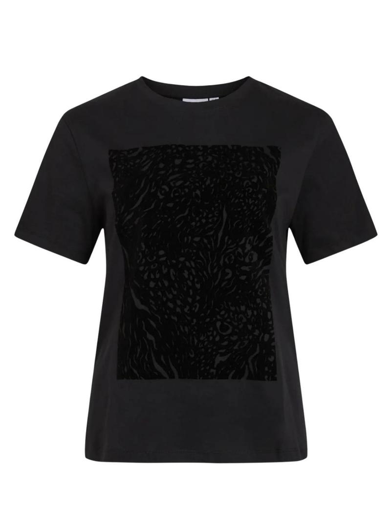 Camiseta Vila. Modelo Visybil. Cor preta. Gola redonda. Manga curta. Corte regular. Detalhe decorativo em textura de veludo no peito.
