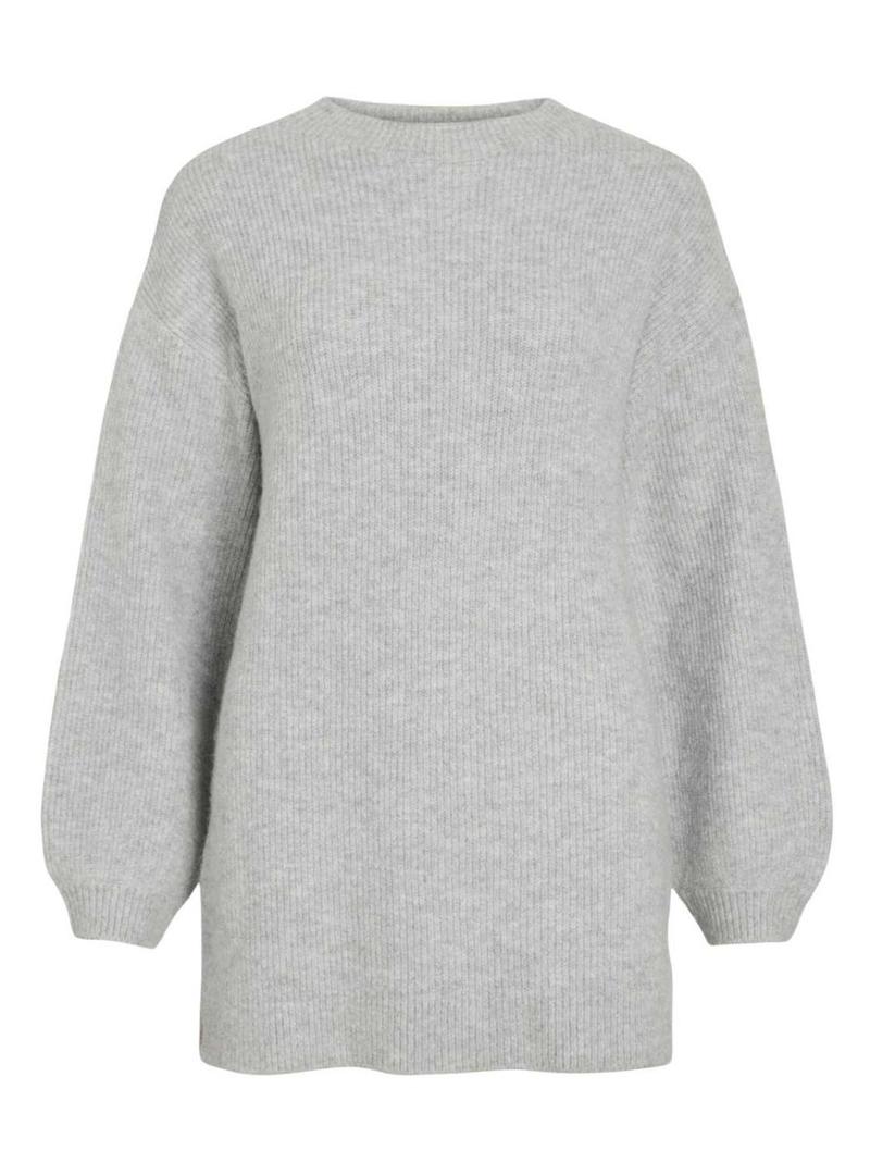 Camisola de malha da Vila. Modelo Vilassia. Cor cinza. Ombros ligeiramente caídos. Aberturas laterais. Malha elástica e macia. Corte folgado.