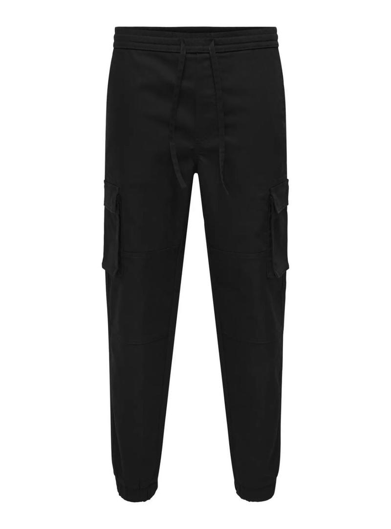 Calça Only and Sons. Modelo Garda. Cor preta. Estilo cargo. Ajuste slim. Bolsos laterais. Bolsos laterais com aba. Cintura elástica ajustável com cordão.