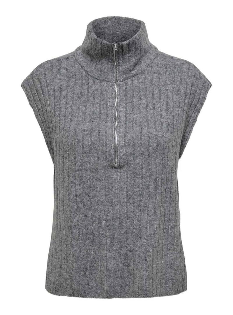 Colete Only. Modelo Jeanett. Cor cinza. Gola alta com meio zíper. Tecido canelado. Ombros ligeiramente caídos. Estilo básico. Toque suave e quente.