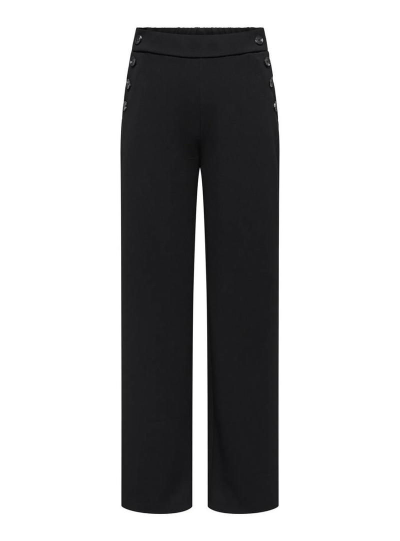 Calça Only. Modelo Rina. Cor preta. Cintura elástica. Ajuste reto. Perna larga. Cintura alta. Detalhes de botões laterais decorativos. Tecido elástico.