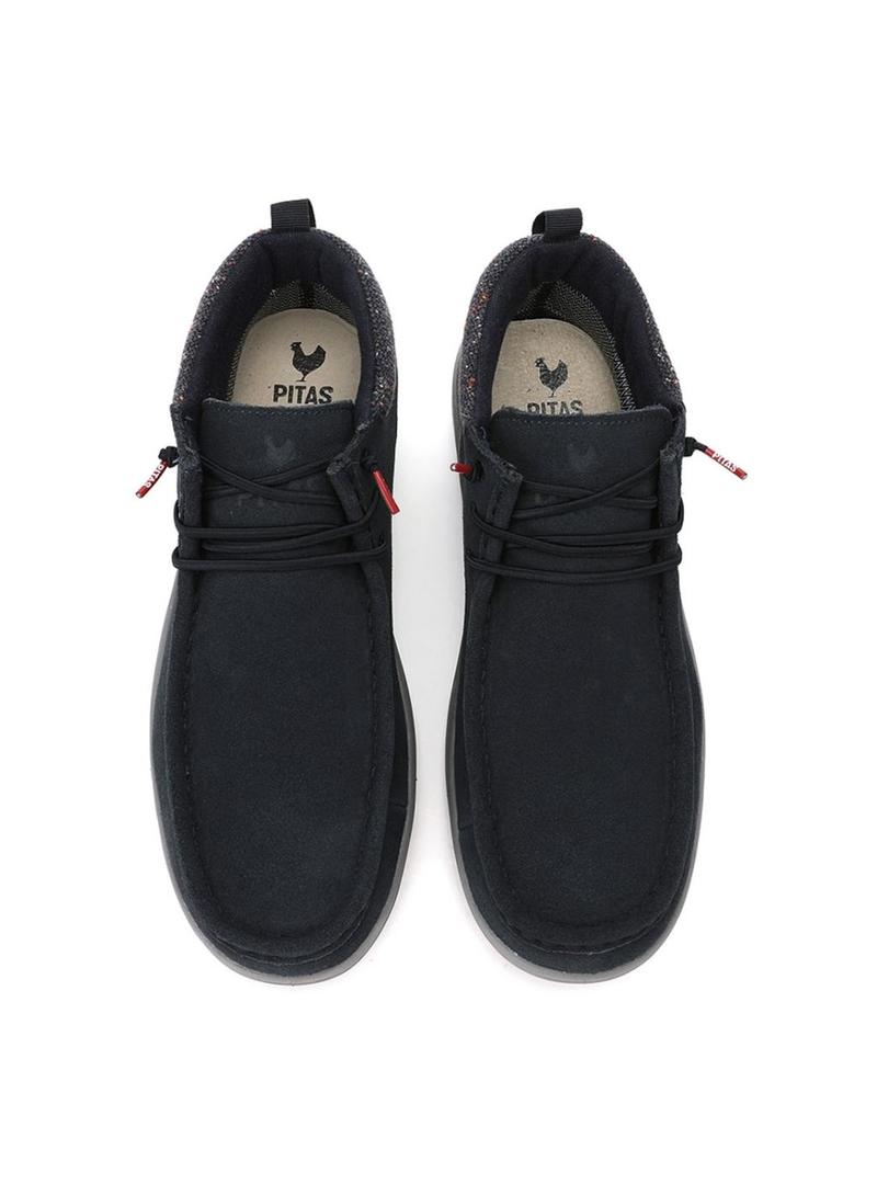 Botas Walkin Pitas. Modelo Baikal. Cor azul marinho. Corte em camurça hidrofugada repelente à água. Calcanhar em nobuck. Forro têxtil com membrana PITAS-TEX que proporciona respirabilidade e conforto. Palmilha removível de EVA PITAS-COMFORT com palmilha de couro. Sola COAST de EVA ultraleve com borracha antiderrapante para uma pisada segura.