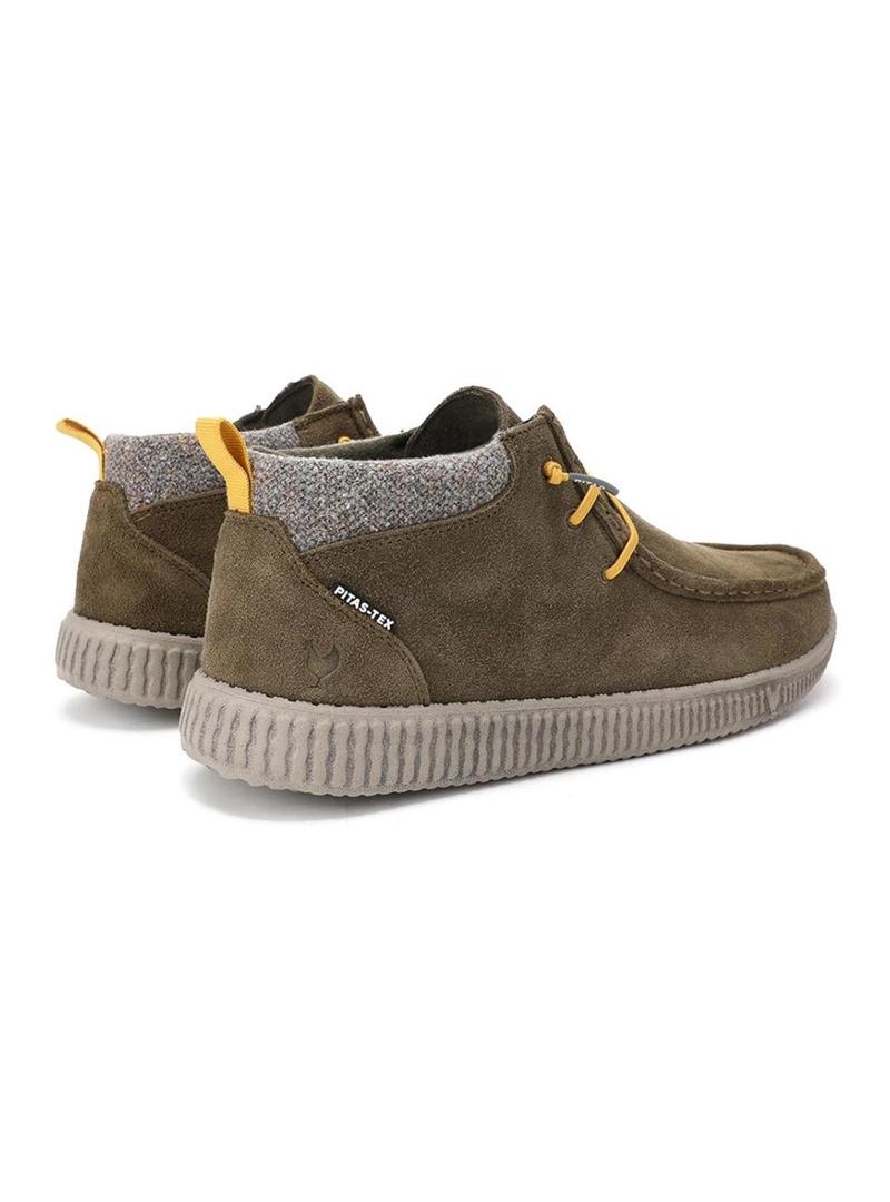 Botas Walkin Pitas. Modelo Wallabi BOB. Cor caqui. Corte em camurça hidrofugada repelente à água com gola em tecido jaspeado. Cadarços elásticos em contraste. Forro em tecido com membrana PITAS-TEX que proporciona conforto e proteção. Palmilha removível de EVA PITAS-COMFORT com palmilha de couro. Sola EVA ultraleve que oferece leveza e flexibilidade. Inclui cadarços elásticos adicionais na cor do modelo.