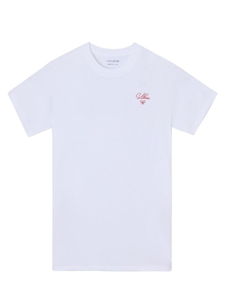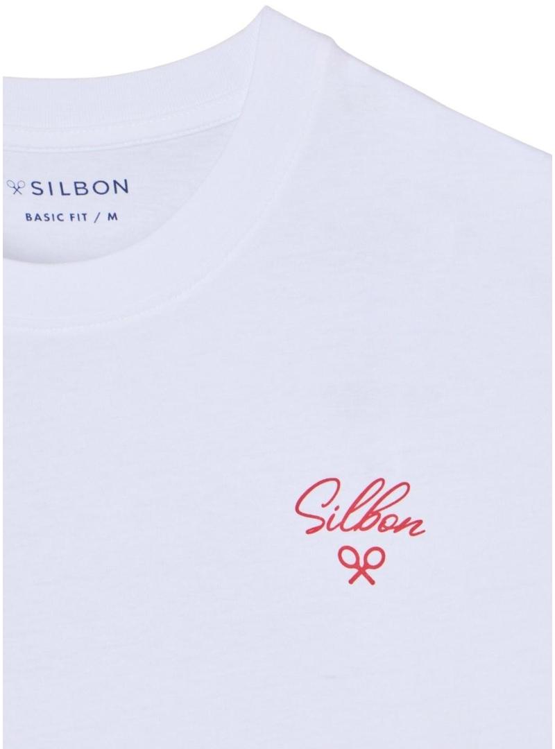Camisa Silbon. Modelo Le Marais. Cor branca. Manga curta. Logotipo no peito. Ilustração de estilo vintage nas costas. Detalhes em vermelho e azul.