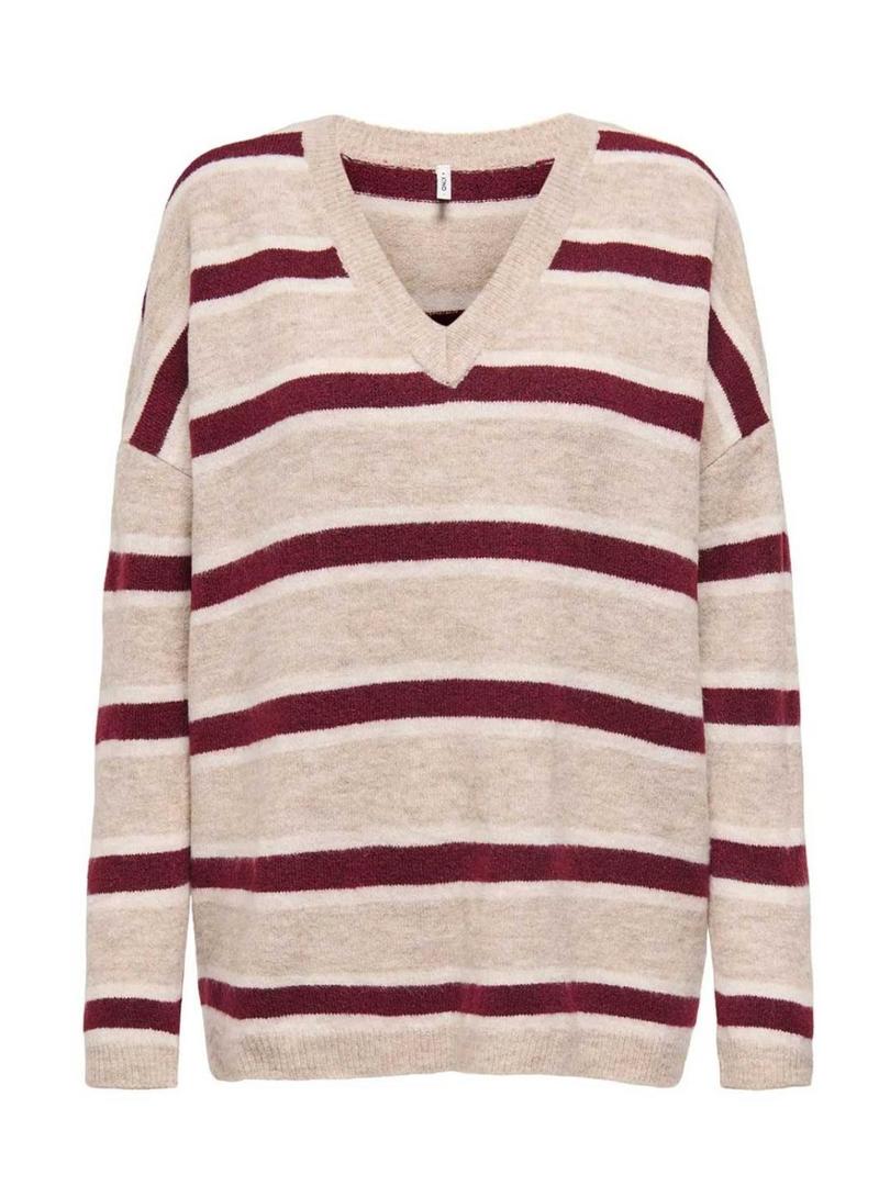 Camisola de malha Only. Modelo Talio. Cor bege e bordô. Motivo de riscas. Decote em V. Manga comprida. Ombros caídos. Corte folgado. Malha confortável e flexível.