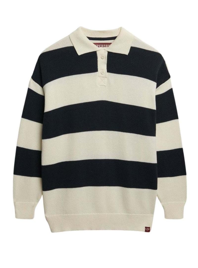 Camisola Superdry. Modelo Listrado Rugby Relaxado. Cor azul-marinho e bege. Gola de camisa com fecho de botões e acabamento em malha canelada. Corte relaxado. Ombros caídos. Listras horizontais em intarsia.