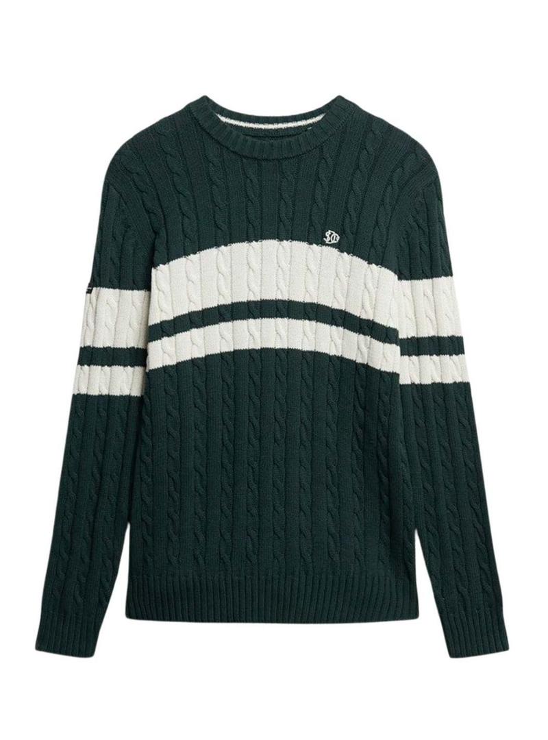 Camisola Superdry. Modelo Cotton Stripe Cable. Cor verde. Corte regular. Gola redonda. Acabamentos canelados. Ponto de trança. Logotipo bordado no peito. Placa da marca na manga. Faixa horizontal em intarsia.