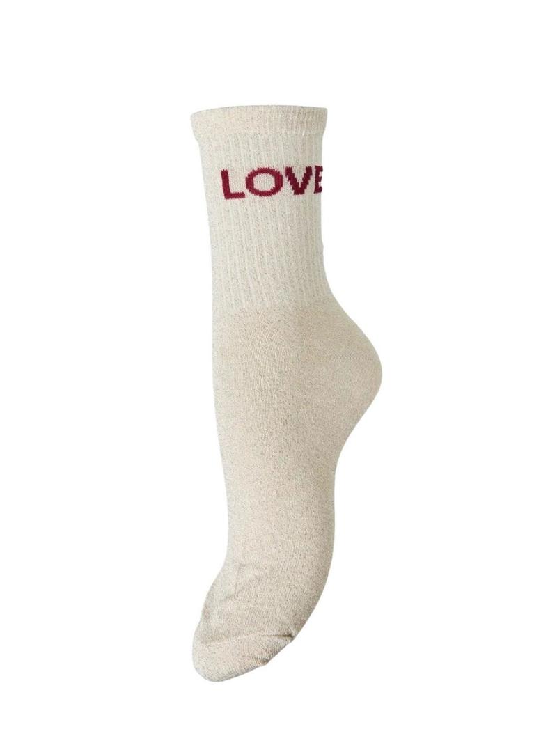 Meias Pieces. Modelo Anna. Cor bege. Cano alto. Mensagem 'AMOR' impressa. Tecido com fios de lurex em dourado.