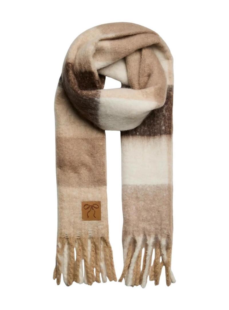 Cachecol Pieces. Modelo Juline. Cor bege. Estampa geométrica. Acabamento com franjas. Remendo bordado com ilustração. Largura 43cm. Comprimento 189cm.