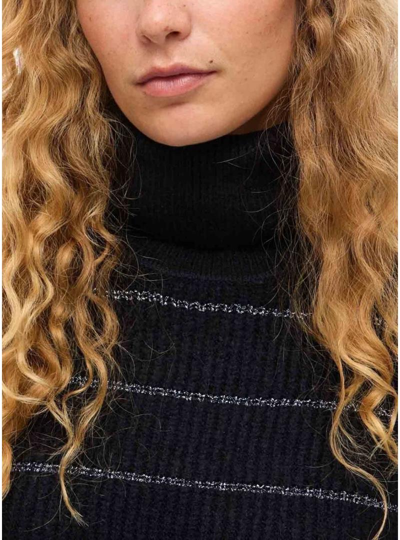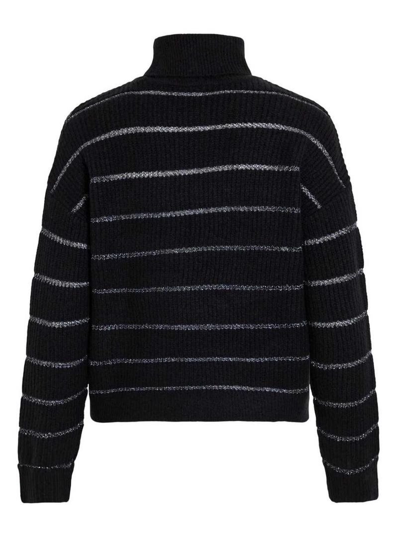 Camisola Vila. Modelo Vizaza. Cor preta. Gola alta. Ajuste folgado. Tecido canelado. Listras horizontais em contraste com fios metalizados.