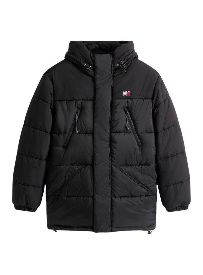 Parca Tommy Jeans. Modelo Mix. Cor preta. Tecido acolchoado. Pequena bandeira da etiqueta na altura do peito. Fecho frontal com zíper de dupla direção e aba coberta. Capuz com cordão ajustável. Bolsos laterais verticais, bolso no peito e bolso interno. Design monocromático com bordado decorativo.