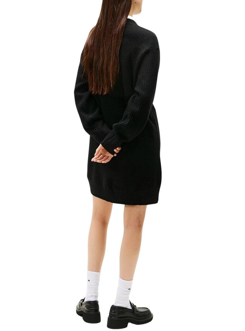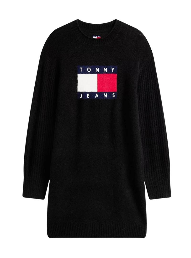 Vestido Tommy Jeans. Modelo Bandeira. Cor preta. Gola redonda. Extremidades caneladas. Ajuste folgado. Corte mini. Tecido de malha macia. Mangas caneladas. Logo em intarsia no peito.