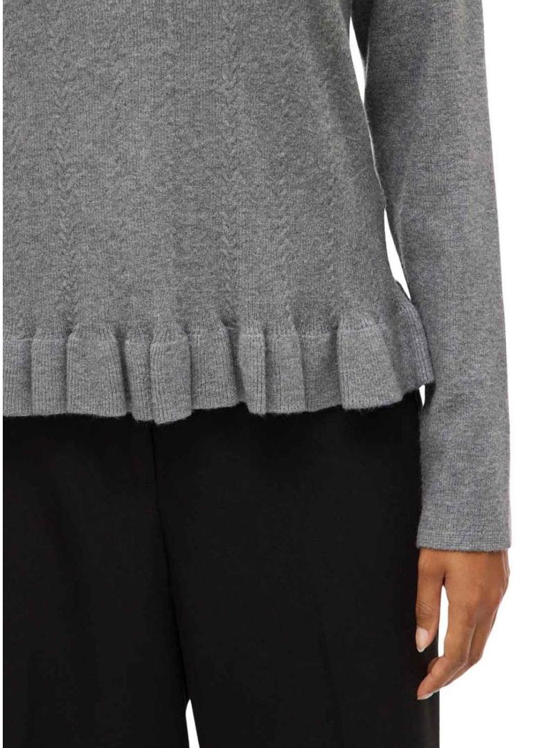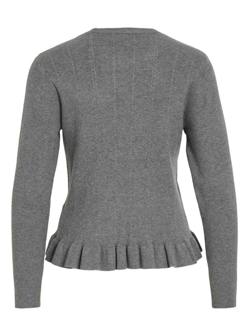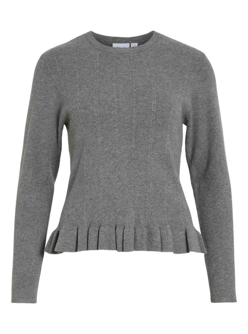 Camisola Vila. Modelo Vinorthy. Cor cinza. Gola redonda. Corte justo. Manga comprida. Tecido canelado. Barra com babado.