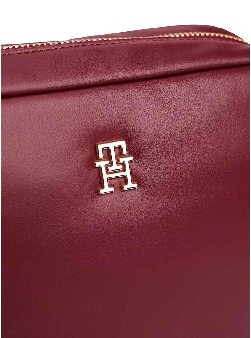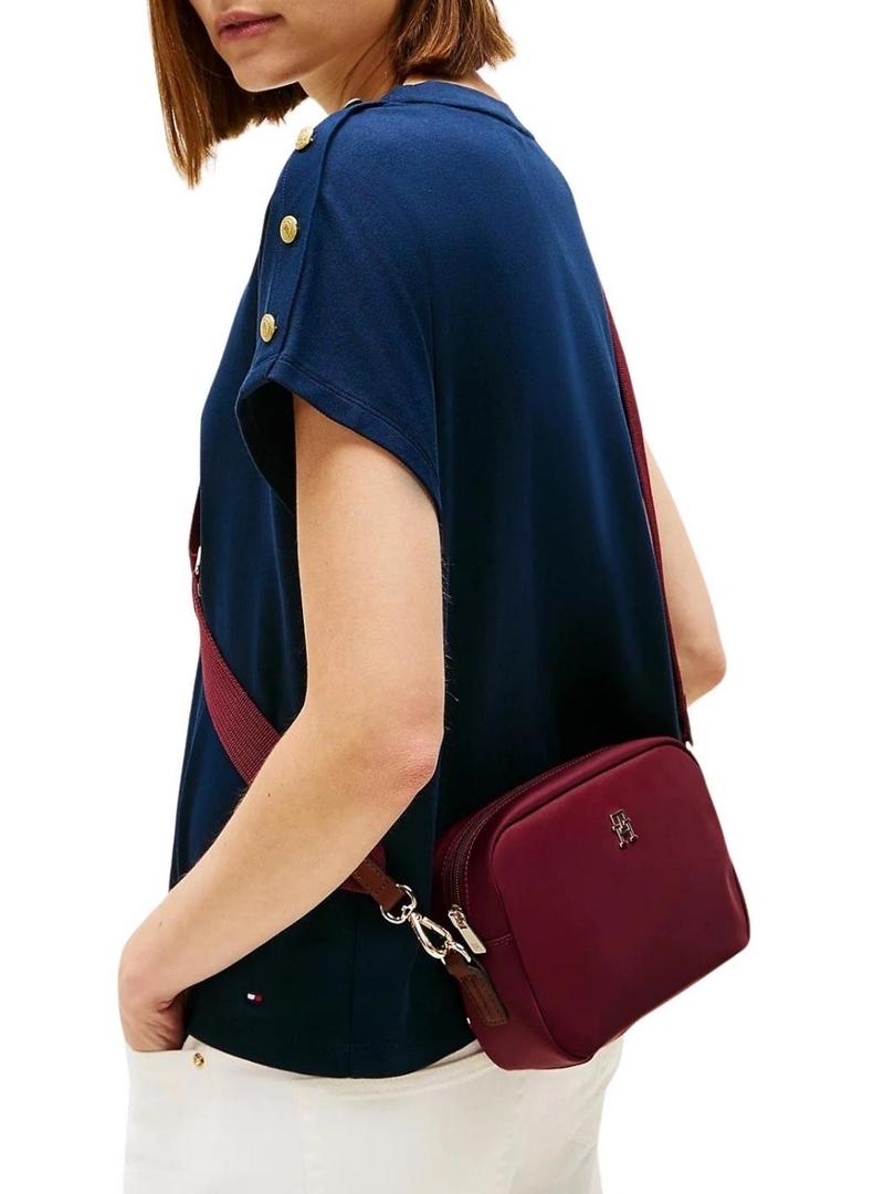 Bolsa Tommy Hilfiger. Modelo Popette Camera nylon. Cor granate. Design arredondado e acabamento liso, com detalhes metalizados. Fecho de correr e alça tecida removível. Detalhes em couro marrom. Compartimento principal com bolso interior com fecho de correr. Decorado com o monograma TH na frente e detalhes característicos da Tommy Hilfiger. Medidas: 21,5 x 6,5 x 15 cm. Capacidade: 2 L.