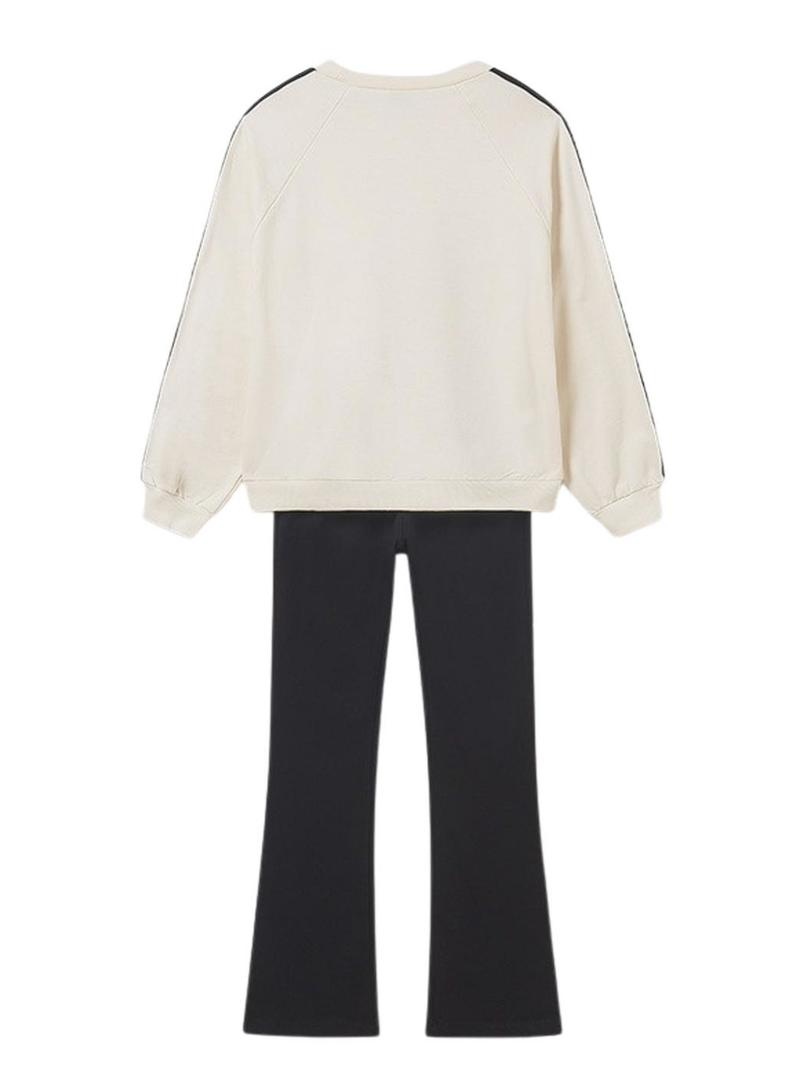 Conjunto Mayoral. Modelo chándal. Camisola bege. Gola redonda. Extremidades elásticas. Imagem estampada no peito com a mensagem Escape The Ordinary. Leggings pretas com corte flare. Cintura elástica.
