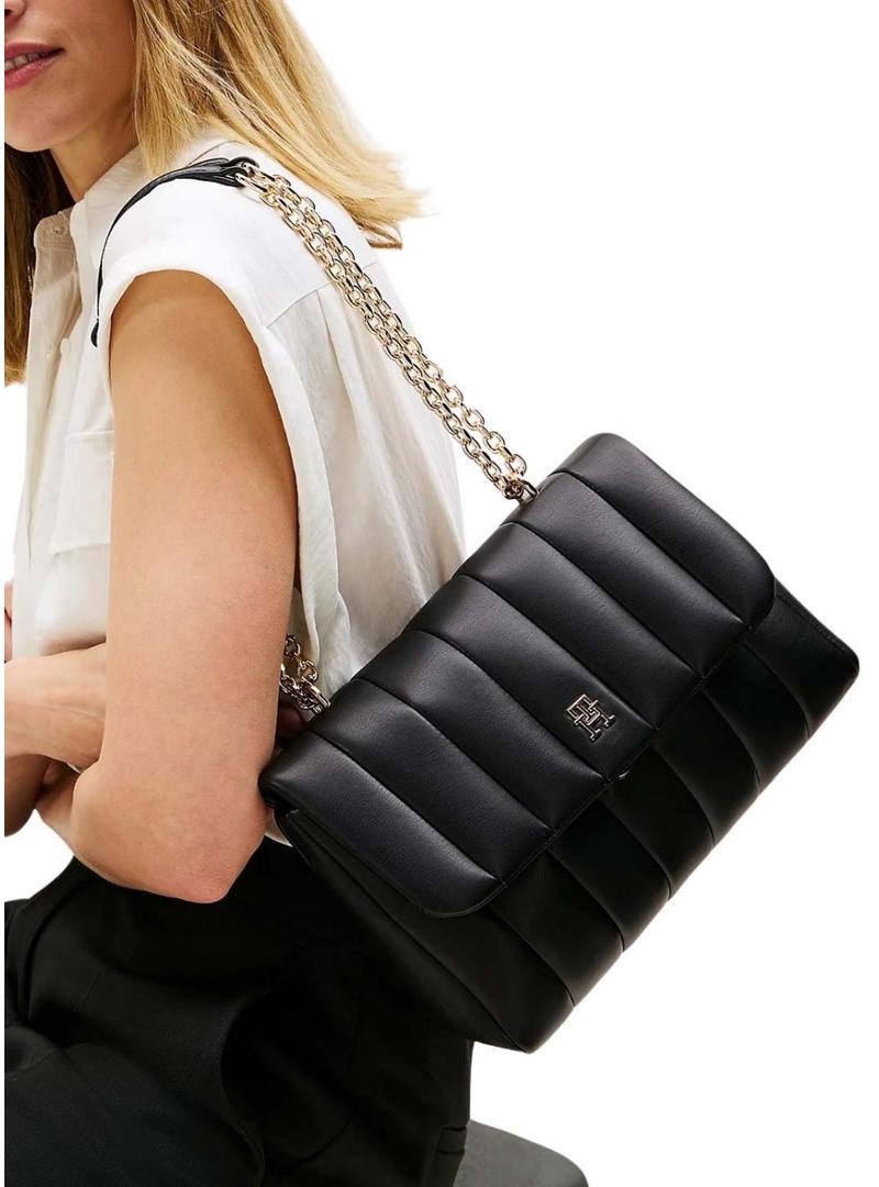 Bolsa Tommy Hilfiger. Modelo Grace. Cor preto. Design acolchoado. Fecho de aba magnético. Alça de corrente ajustável. Compartimento principal com bolso interno com zíper. Emblema do monograma TH na frente e detalhes distintivos da Tommy Hilfiger. Medidas: 28 x 10 x 17 cm. Capacidade: 2,8 L.