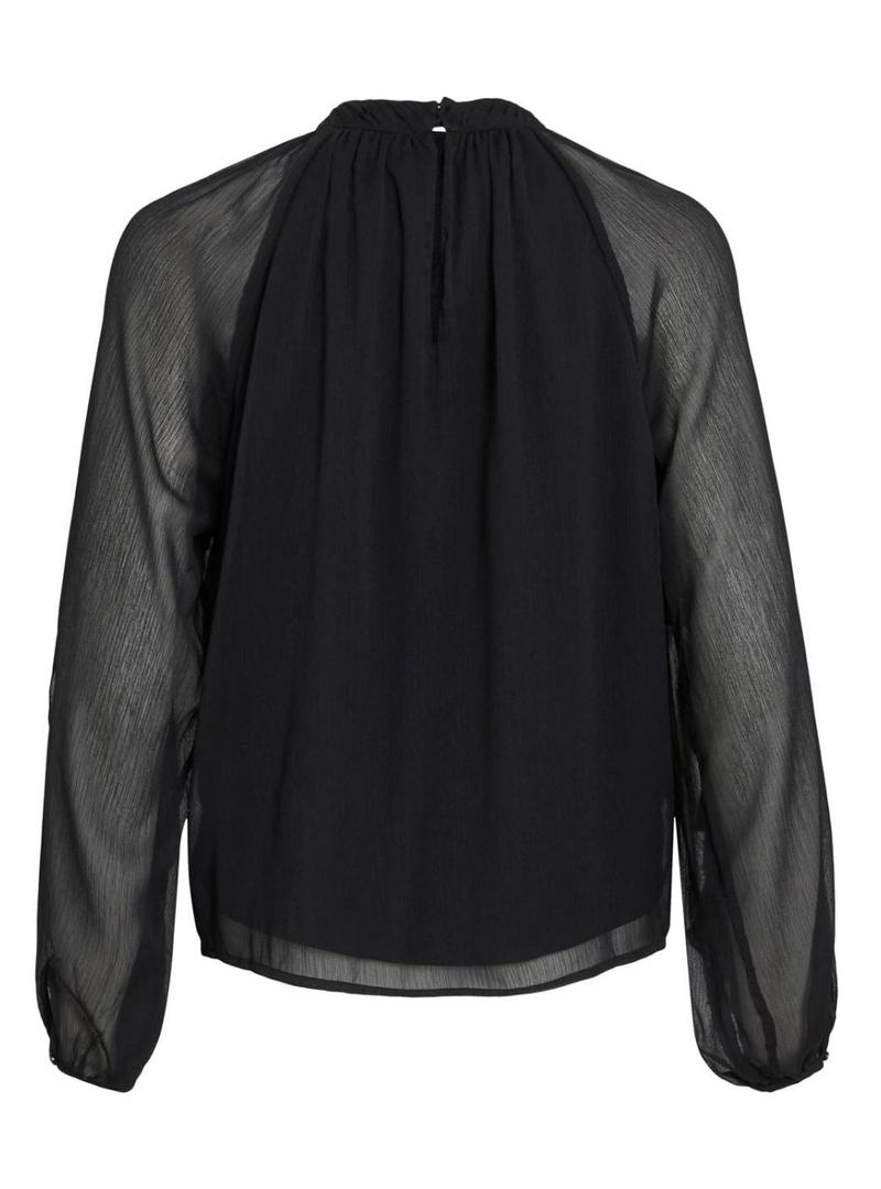 Blusa Vila. Modelo Vibinna. Cor preta. Gola alta com fecho de botões atrás. Tecido leve de gaze transparente. Corpo forrado. Silhueta vaporosa. Babados nas mangas.