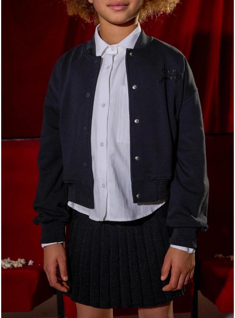 Jaqueta Mayoral. Modelo Bomber. Cor preta. Fecho com botões de pressão na parte da frente. Bolsos na frente. Mensagem em relevo no peito. Gola e extremidades caneladas.