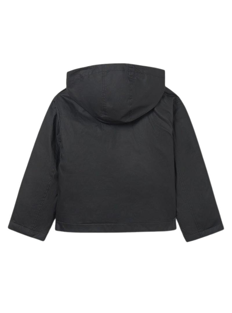 Casaco Mayoral. Modelo encerado. Cor preta. Manga comprida. Gola camiseira em contraste de veludo marrom. Modelo com capuz. Fecho com botões na parte da frente. Forro interno suave de poliéster. Bolsos de remendo na parte da frente.