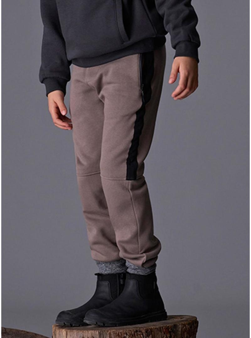 Calça Mayoral. Modelo Jogger. Cor marrom. Linha lateral em contraste preto. Estilo jogger esportivo. Cintura elástica com cordão. Bolso traseiro funcional. Bolsos com zíperes.