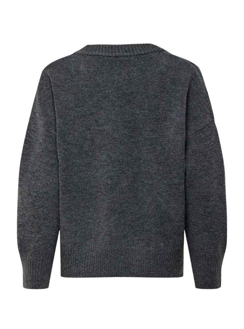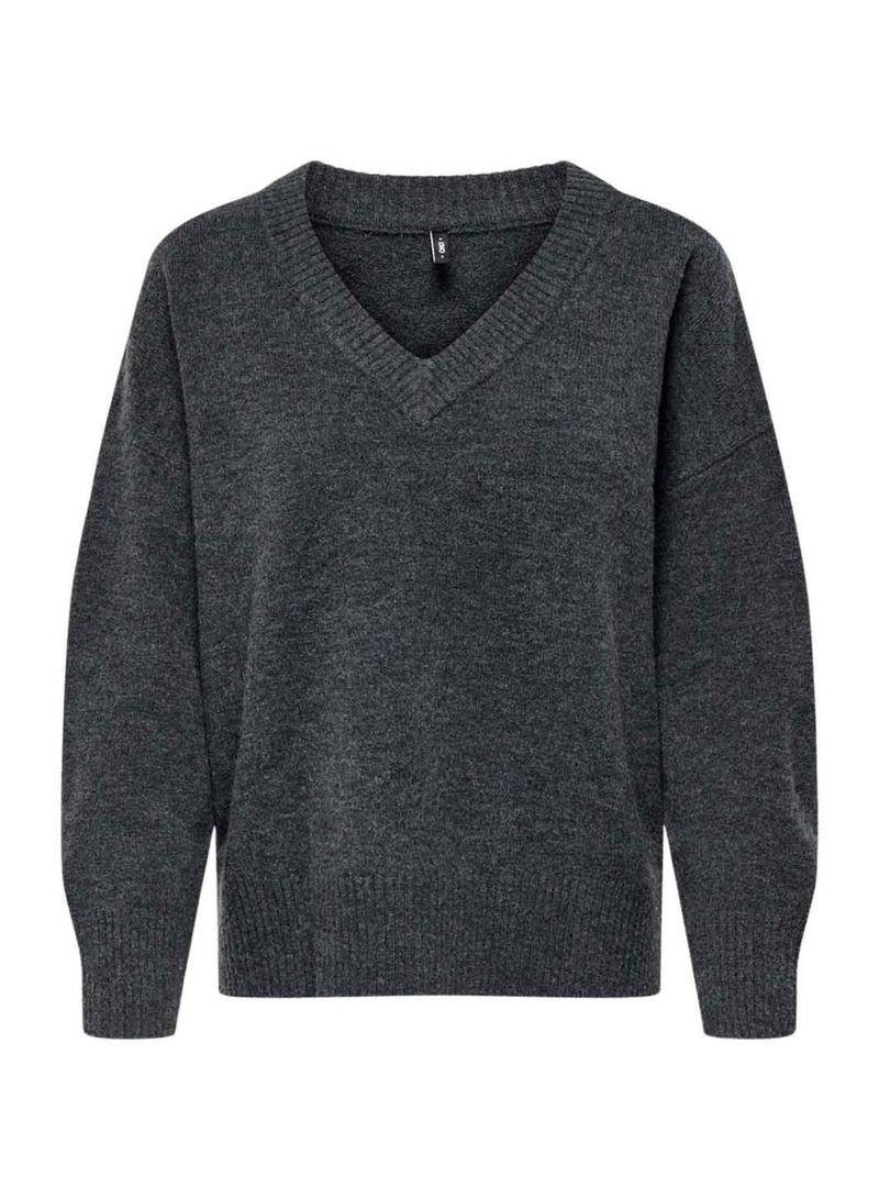 Camisola Only. Modelo Mari. Cor cinza escuro. Decote em V. Ajuste folgado. Extremidades caneladas. Estilo básico.