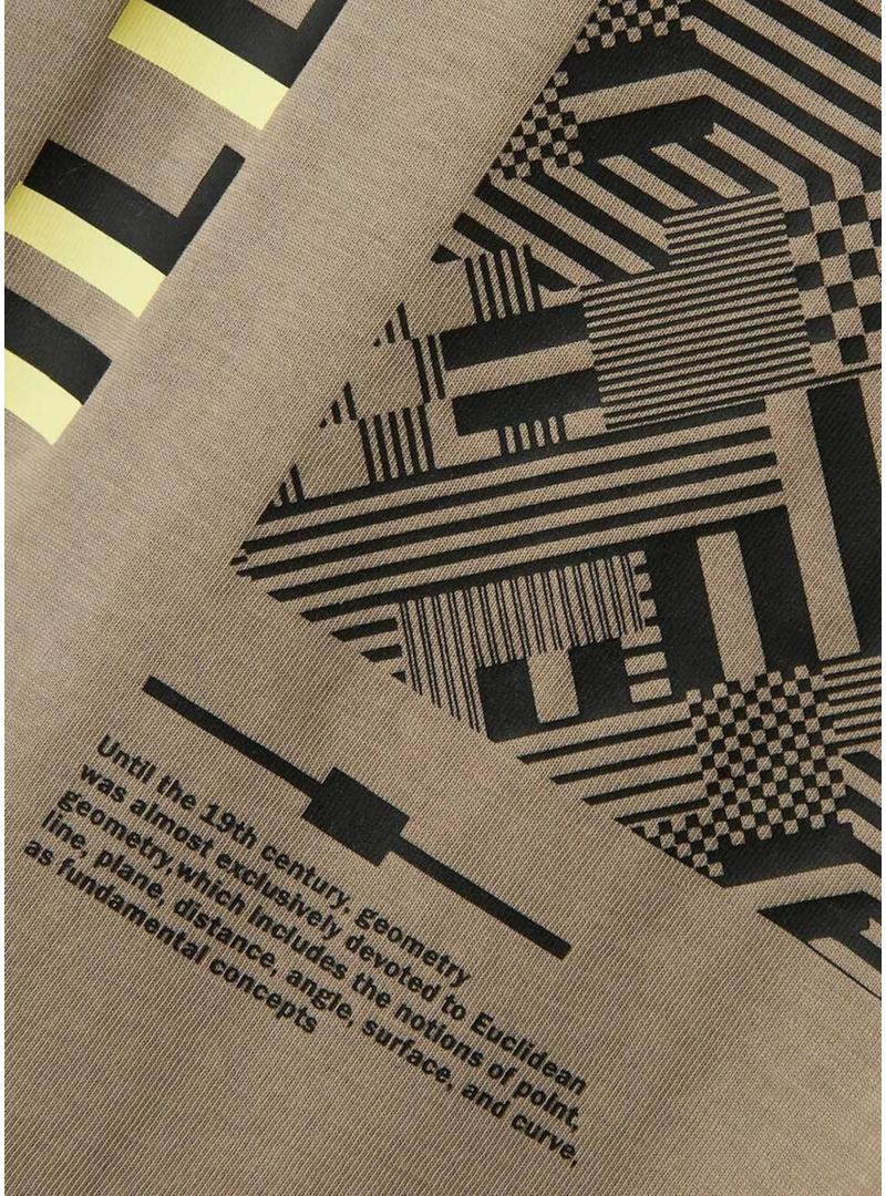 Camiseta Name It. Modelo Mobay. Cor bege. Manga comprida. Extremidades das mangas caneladas. Ajuste folgado. Mensagem Illusion estampada na parte de baixo. Ilustração abstrata nas costas.