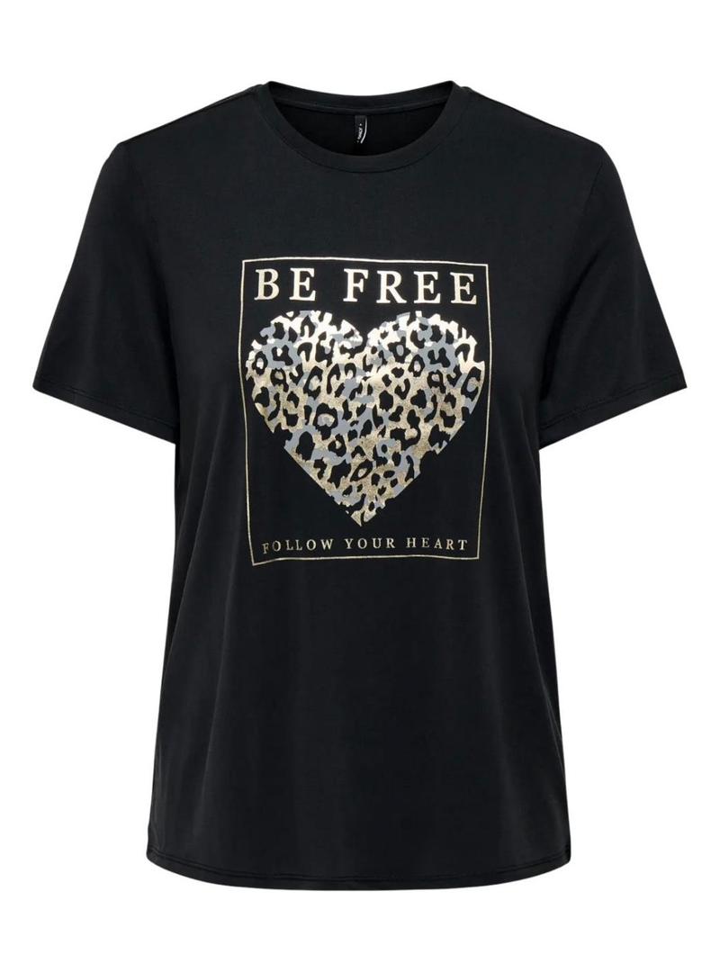 Camiseta Only. Cor preta. Coração estampado de leopardo no peito. Manga curta. Formato regular. O modelo usa tamanho S.