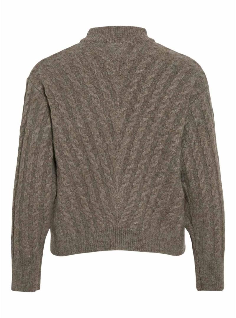 Camisola Vila. Cor tostado. Tecido suave de malha entrelaçada. Manga comprida. Ombros caídos. Gola redonda. Corte regular. Gola alta. O modelo veste o tamanho S.