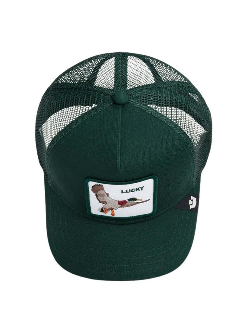 Boné Goorin Bros. Modelo Lucky Duck. Cor verde. Parte de trás em rede verde. Fita ajustável na parte de trás. Etiqueta lateral da marca. Patch de Pato bordado na frente.