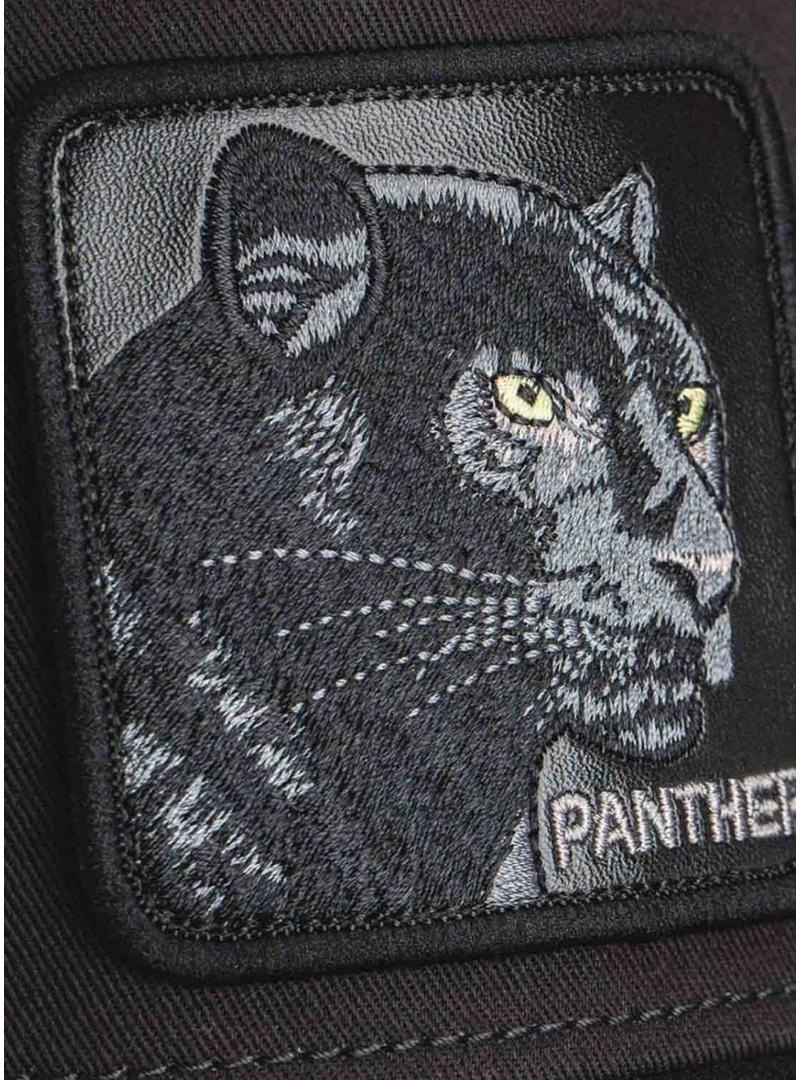 Boné Goorin Bros. Modelo Panther. Cor preta. Parte traseira de malha. Fita ajustável na parte de trás. Etiqueta lateral da marca. Patch da Pantera bordado na frente.