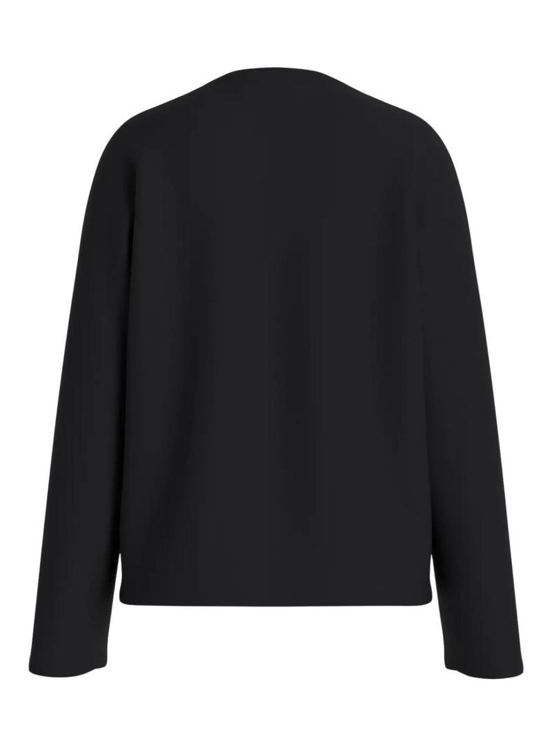 Moletom Vila. Cor preta. Manga comprida. Gola redonda. Ombros caídos. Detalhes de aberturas. Tecido suave. Corte regular. A modelo veste o tamanho S.