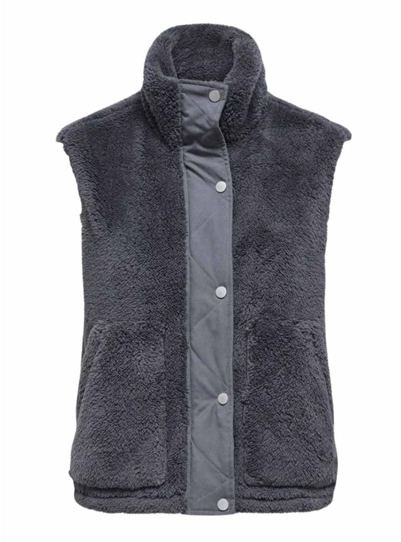 Colete Only. Cor cinza. Sem mangas. Tecido de pelo macio. Bolsos laterais. Acabamento em tecido contrastante. Gola alta. Fecho frontal com botões. Formato regular. O modelo veste o tamanho S.