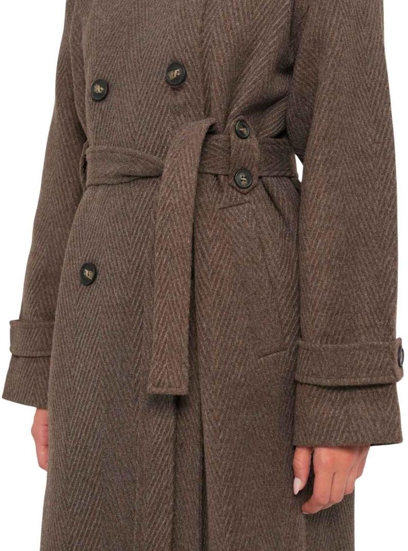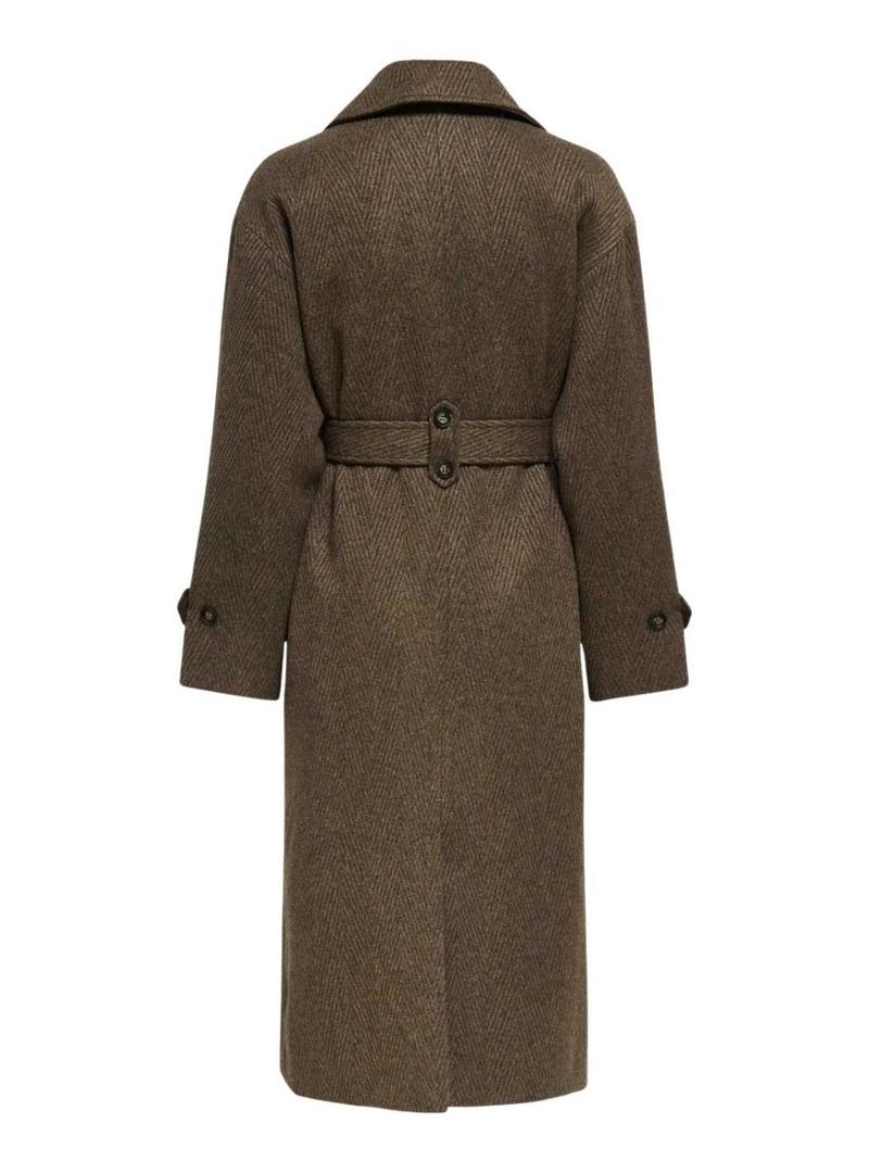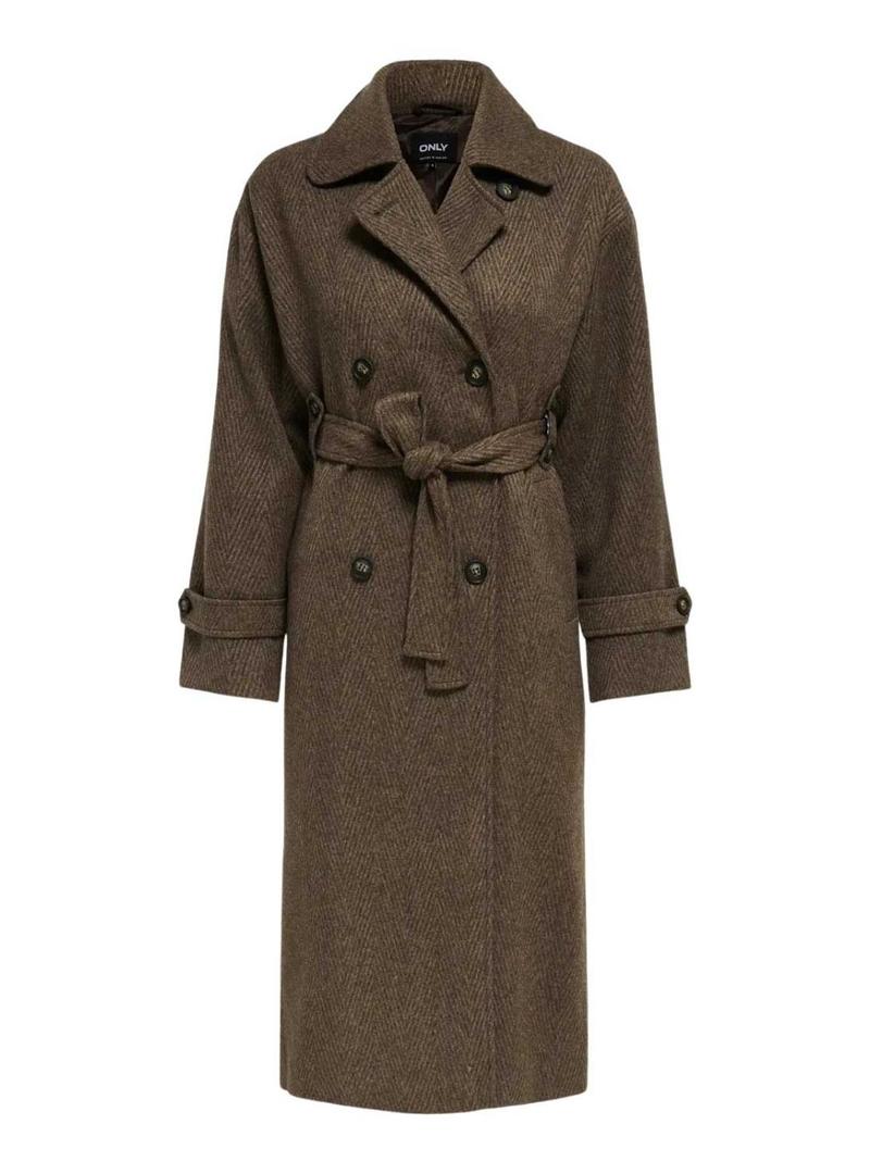 Casaco Only. Cor marrom. Manga comprida. Formato longo. Com cinto. Gola com lapelas. Fechamento cruzado com botões. Bolsos frontais. Abertura traseira. Ombros caídos.