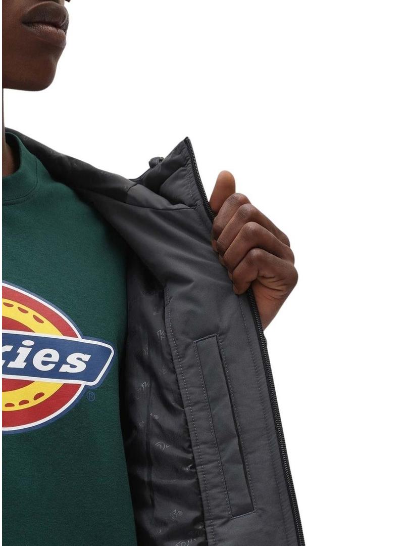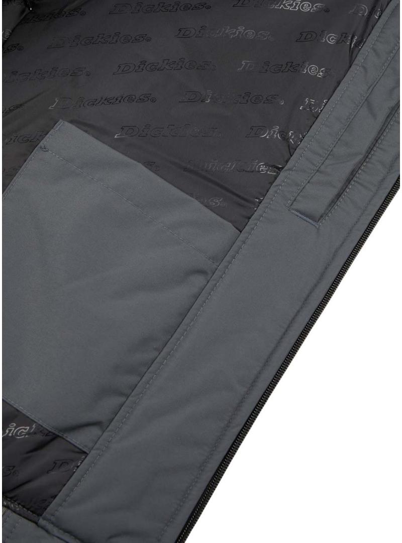 Jaqueta Dickies. Modelo Sarpy. Cor cinza. Fechamento frontal com zíper. Tecido resistente à água. Bolsos laterais. Um bolso interno. Logotipo da marca no peito. Com capuz. Corte reto. Bainha com elástico.