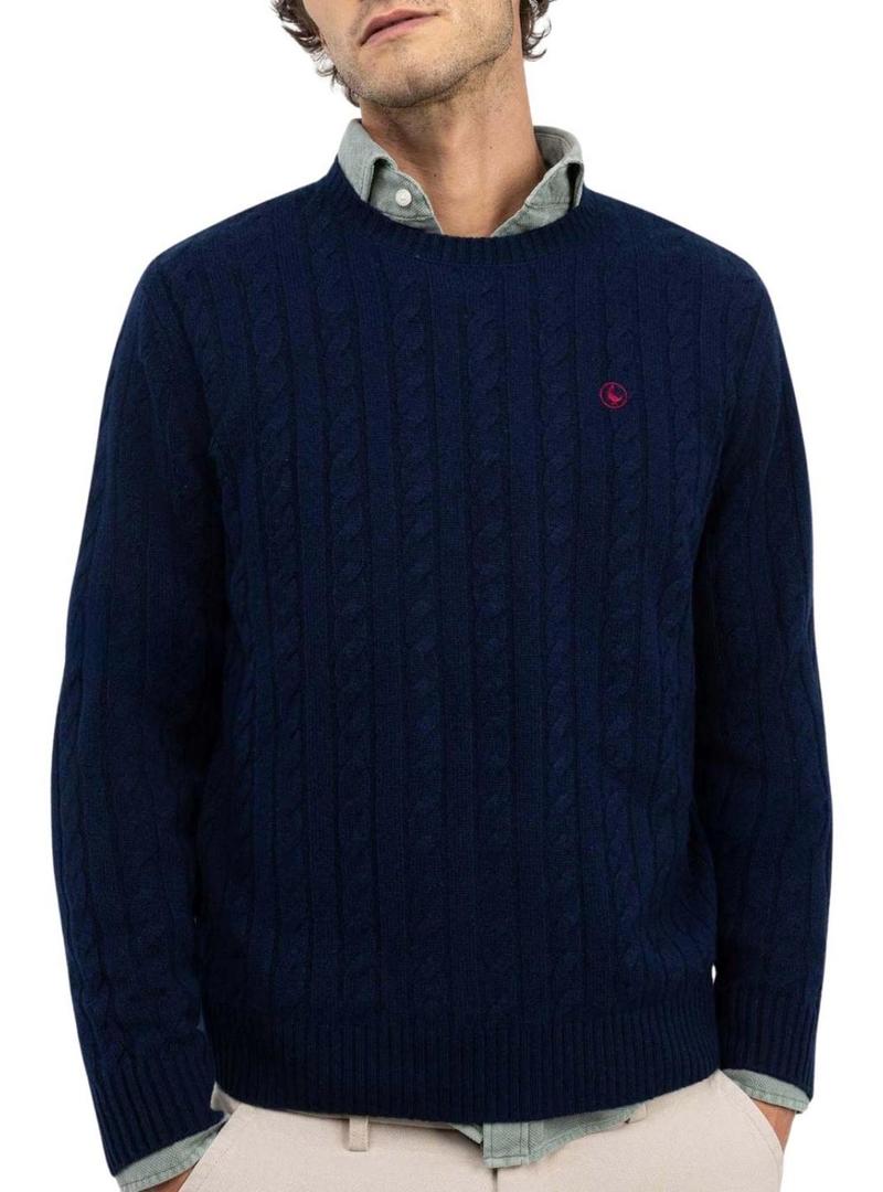Camisola El Ganso. Cor marinho. Malha de ponto de trança. Gola redonda. Logotipo bordado no peito em contraste. Acabamentos canelados. Feito com lã. O modelo veste tamanho M.