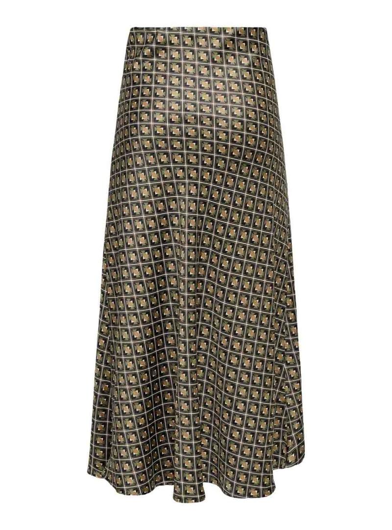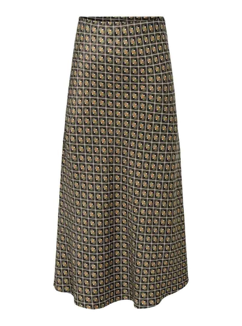 Saia Only. Cor verde. Estampa geométrica. Cintura com elástico. Comprimento midi. Feita com tecido reciclado.