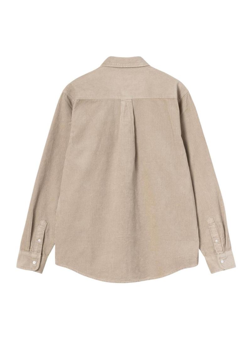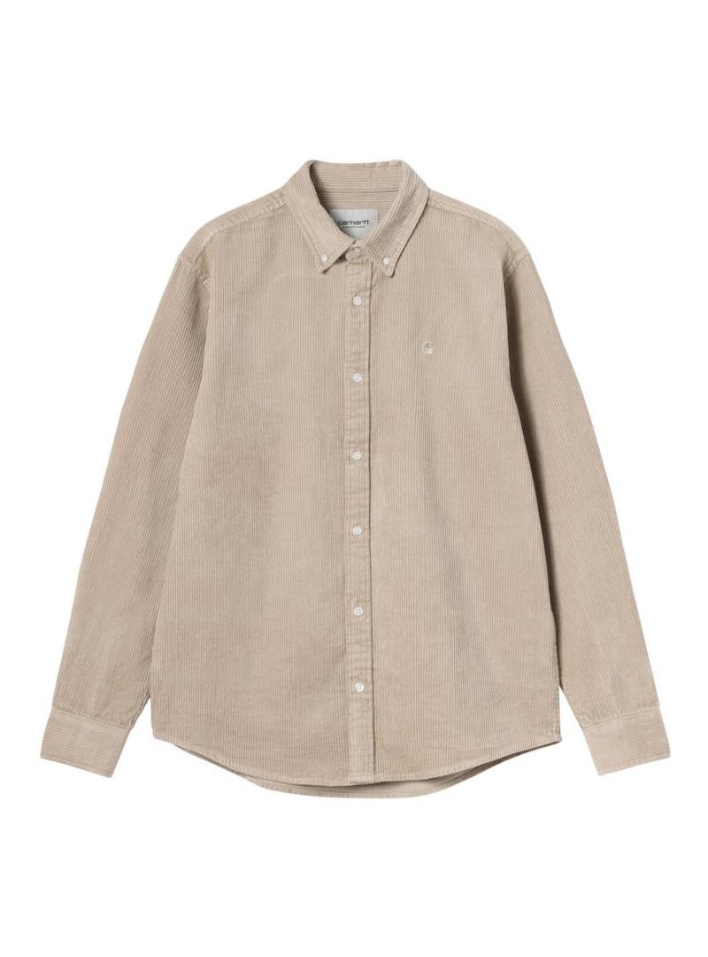 Camisa Carhartt. Cor bege. Tecido de veludo cotelê. Logotipo bordado no peito em branco. Fecho frontal com botões. Formato regular. Barra arredondada. Gola de camisa com botões. O modelo veste tamanho M.
