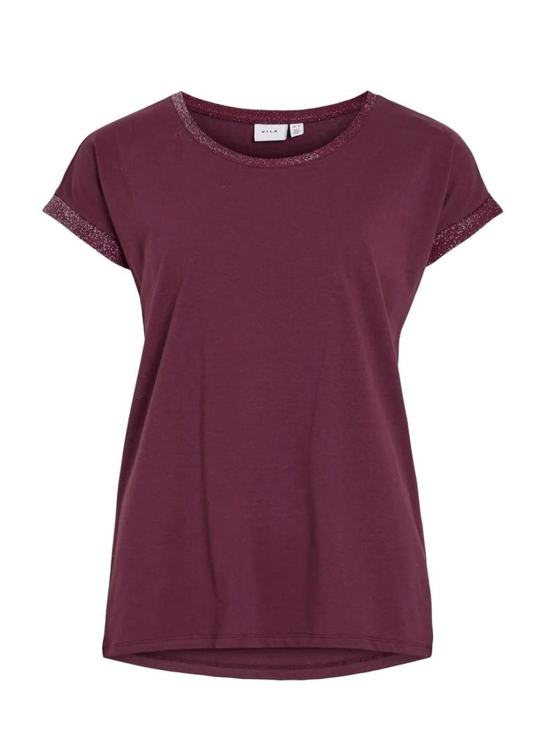 Camiseta Vila. Modelo Vidreamers. Cor granate. Manga curta. Gola redonda. Detalhe de glitter na gola e mangas. Corte regular.