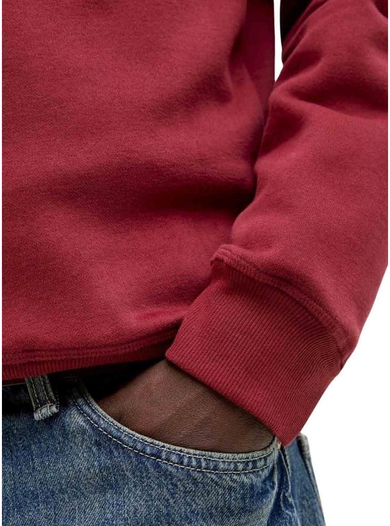 Moletom Jack and Jones. Cor vermelha. Gola redonda. Logotipo bordado no peito. Acabamentos canelados. Ajuste relaxado. Feito com algodão orgânico. O modelo está usando o tamanho M.
