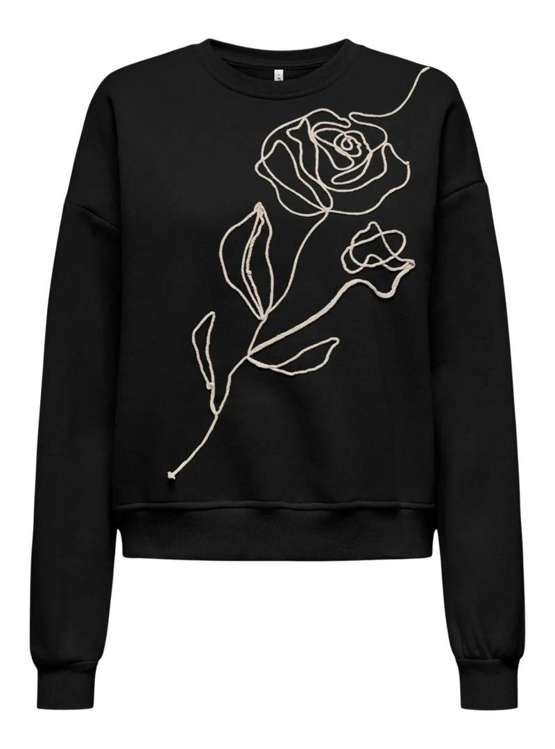 Moletom Only. Cor preta. Gola redonda. Mangas compridas. Ombros caídos. Corte regular. Rosa em relevo em branco na parte da frente. Acabamentos elásticos.