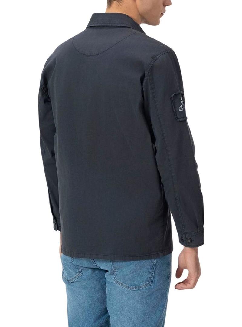 Camisa El Pulpo. Cor marinha. Fecho frontal com botões. Dois bolsos frontais com aba. Manga comprida. Detalhe de remendo na manga esquerda. Print oPolvo na manga direita. Detalhe de logo bordado em contraste na aba do bolso. Formato regular.
