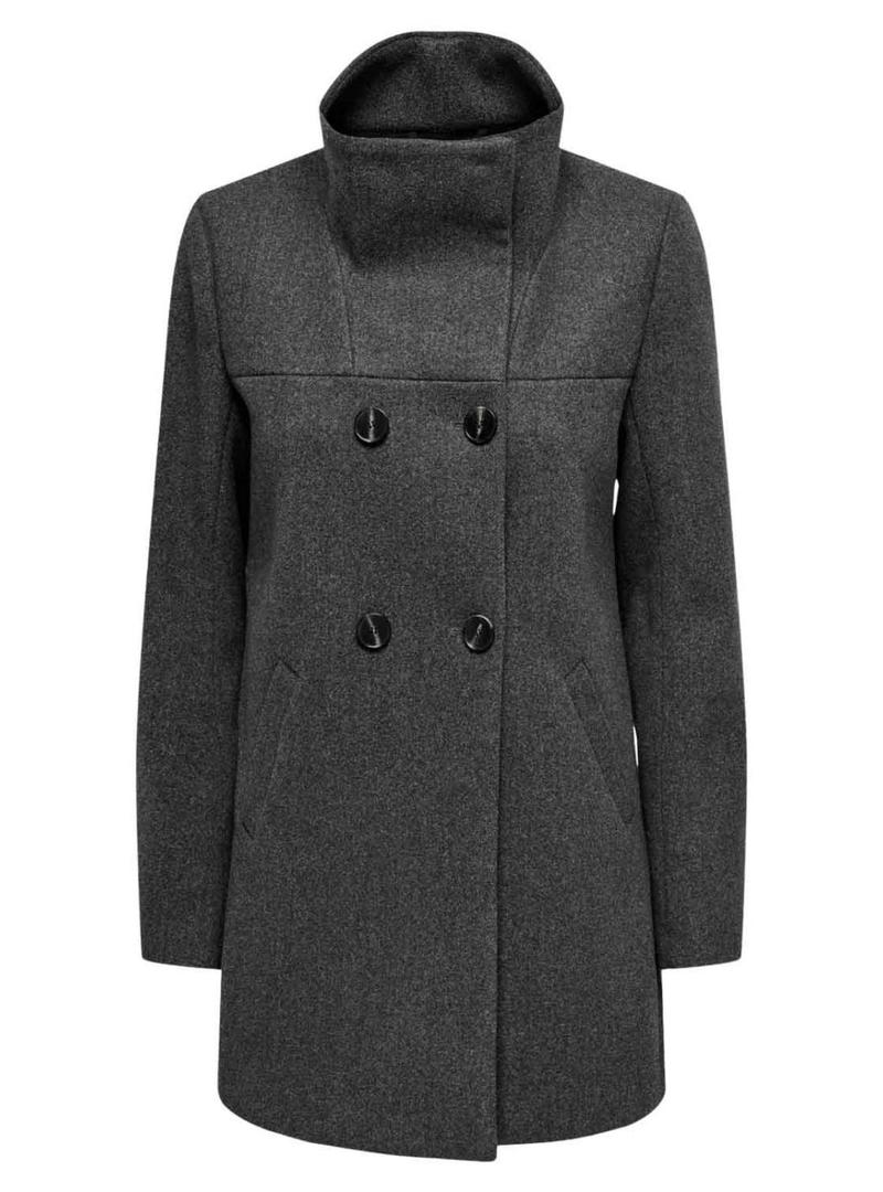Casaco Only. Cor cinza. Manga longa. Gola alta. Fechamento com botões de dupla fileira. Bolsos laterais. A modelo veste o tamanho S.
