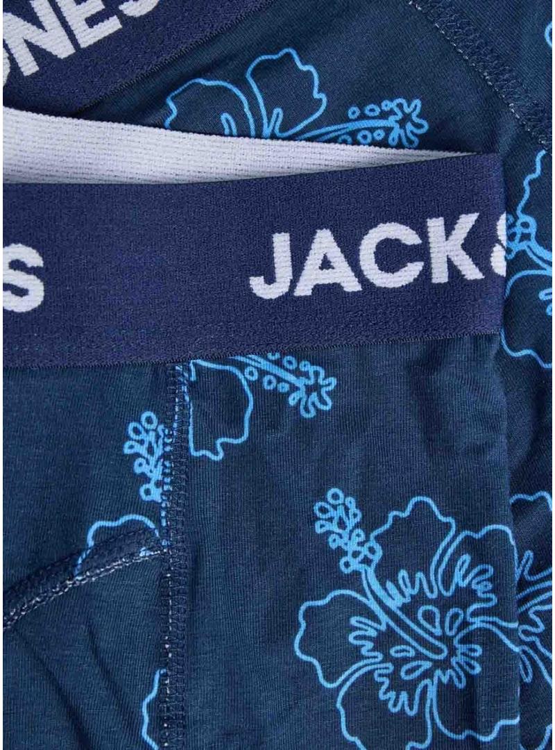 Pack de cuecas Jack and Jones. Modelo Anthony. Cor azul. Pack de três boxers. Cintura elástica com marca. Estampado de flores havaianas. Estampado de poás. Básico.