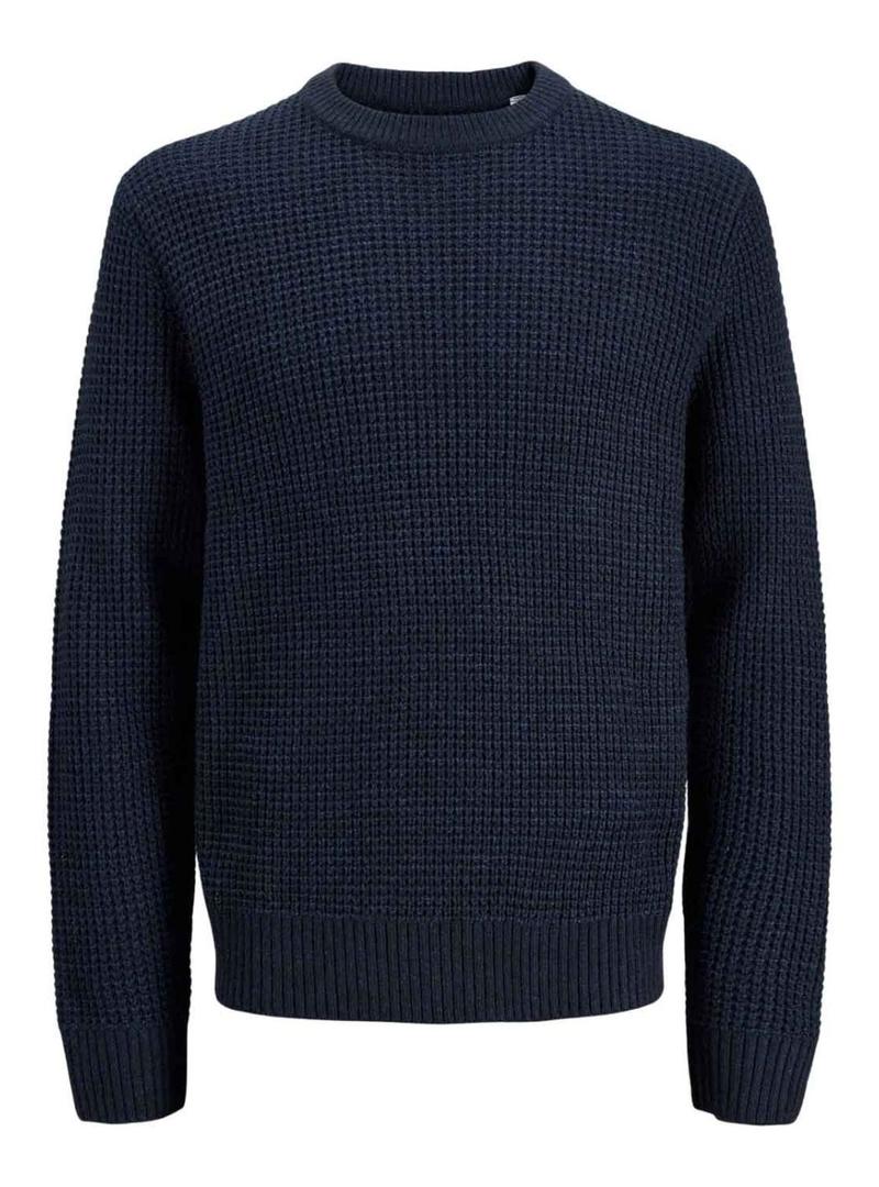Camisola Jack and Jones. Modelo Global. Cor azul marinho. Ajuste regular. Gola redonda. Estilo básico. Extremidades caneladas. Tecido com textura em relevo.