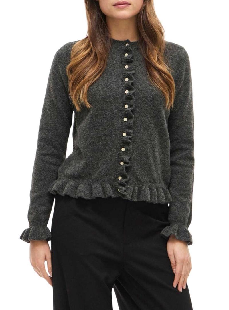 Casaco Vila. Cor cinza. Gola redonda. Manga comprida. Tecido de malha. Fecho frontal com botões. Detalhes de babados. Formato regular.