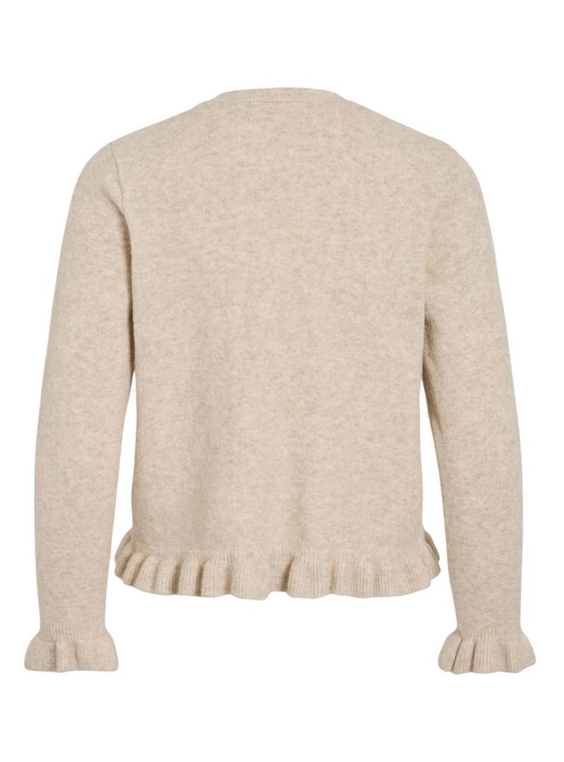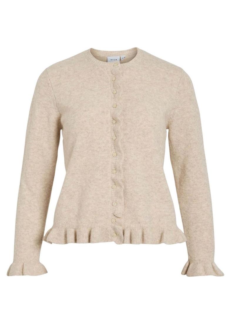 Jaqueta Vila. Cor bege. Gola redonda. Manga comprida. Malha macia. Fechamento com botões. Detalhes de babados. Formato regular. A modelo veste o tamanho S.