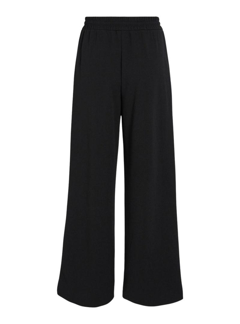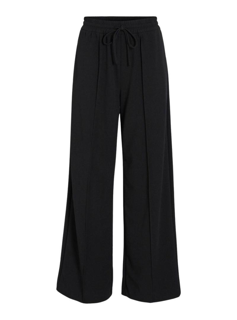 Calça Vila. Modelo Viclua. Cor preto. Cintura alta. Cintura ajustável com cordão elástico. Bolsos laterais. Perna larga. Costuras centrais decorativas. Tecido elástico. O modelo veste o tamanho S.